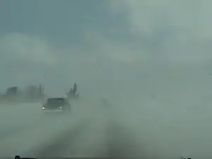 Ground blizzard refers to a weather condition where loose snow or ice on the ground is lifted and blown by strong winds.[1] This can occur in the absence of precipitation, and can even occur when the sky is clear. This is in contrast to "ordinary" blizzards, which are accompanied by heavy falling snow. They can be especially dangerous as they occur after a winter storm has passed, when it is assumed that all forms of severe winter weather has ended.[2]