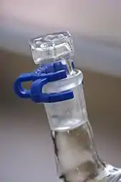 Round-bottom flasks often have one or more conically tapered ground glass joint openings, or necks. Conventionally, these joints at the flask necks are outer joints. Other adapters, such as distillation heads and vacuum adapters, are made with joints that fit in with this convention. If a flask or other container has an extra outer ground-glass joint on it, which needs to be closed off for an experiment, there are often conically tapered inner ground-glass stoppers for that purpose. In some cases, small hook-like glass protrusions may be fused onto the rest of the glass item near a joint to allow an end loop of a small spring to be attached, so the spring helps keep joints temporarily together. The use of a special very small size of conically tapered fitting for glass, plastic, or metal parts called a Luer fitting or adapter has become more widespread. Originally, Luer fittings were used to connect the hub of a needle to a syringe. Where the use of ground glass presents a problem, as in the production or distillation of diazomethane (which may explode on contact with rougher surfaces), equipment with smooth glass joints may be used.