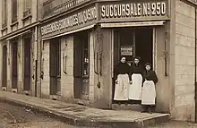 Geoffroy Guichard was born on 27 July 1867 in Feurs, in the Auvergne-Rhône-Alpes region. His parents were the owners of a retail grocery business in Saint-Étienne. In 1889, he married Antonia Perrachon and became a partner with Paul Perrachon, his cousin-in-law, who had been the owner of a shop in the region for around ten years. Geoffroy Guichard became the sole business owner in 1892.[8] The store, located rue des Jardins, was originally the Lyrical Casino of Saint-Étienne. Closed in the 1850s,[9] the Lyrical Casino was transformed into a retail grocery store in the 1860s. Geoffroy Guichard grew the grocery store to turn it into a general food store, based on the Felix Potin model. In April 1898, due to the success of the concept, Geoffroy Guichard opened the first branch in Veauche, in Loire.[10]