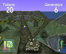 Grudge Warriors places the player in control of one of eleven special armored cars.[2] Each one is equipped with five types of weaponry. Four of the weapons are similar on all the cars; the fifth weapon is unique to the vehicle.[3] In single-player, the objective for each mission is to destroy enemy tanks, gun emplacements, vehicles, and generators; there are always eight at each base which must be destroyed.[4] In addition, players can collect tokens as an optional objective; these tokens allow for upgrades and boost the player's score. Some generators can only be reached by solving puzzles; for example, toggling switches which lower otherwise-impenetrable shields surrounding a generator.[4] Every player vehicle features both armor and health; powerups which replenish both can be found scattered throughout the maps. In addition, the player has only a finite amount of ammunition for each weapon. When the player's health is reduced to zero, the game is over and the mission must be restarted.