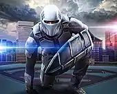 The Guardian possesses exceptional combat and tactical skills. He was trained in many forms of fighting, and excelled at gymnastics, thinking quickly on his feet, and deduction. His only weapons are his golden helmet and shield. Guardian often used a customized motorcycle equipped with autopilot and a set of video cameras filming from various angles and recorded on videodisc.