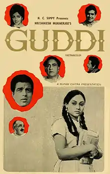 Guddi is a 1971 Hindi drama film directed by Hrishikesh Mukherjee and written by Gulzar. It starred Dharmendra, Jaya Bachchan and Utpal Dutt. It is Jaya Bachchan (née Bhaduri)'s career-making film in which she plays a schoolgirl who has a crush on and is obsessed with the actor Dharmendra, who plays himself. She earned a Filmfare nomination as Best Actress, the only nomination for the film.[1] Utpal Dutt also has a starring role. Many popular Bollywood actors like Rajesh Khanna, Naveen Nischol, Asrani, Amitabh Bachchan, Om Prakash and Pran gave guest appearances as themselves. The film became a "big city hit" and did "above average" business everywhere else.[2] It was later remade in Tamil as Cinema Paithiyam (1975) starring Jayachitra and Kamal Haasan.[3]