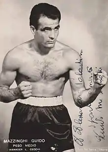 Guido Mazzinghi (14 May 1932 – 1996) was an Italian middleweight boxer. He competed in the 1952 Summer Olympics, but was eliminated in the third bout.[1] In 1954 he turned professional and retired in 1957 as a reigning Italian champion with a record of 35 wins out of 36 bouts. His younger brother Alessandro was also a professional boxer.[2][3]