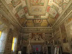 Guido came to his father's aid during the Rossi War against Ludovico il Moro and was thus declared a rebel by the duchy of Milan. He successfully held the Rocca dei Rossi in San Secondo against a Sforza siege under Antonio del Vasto (son of the marquess of Saluzzo), who was killed during the siege.[3] Guido put a price on Sforza's head but the situation soon worsened. He was promised Venetian reinforcements but these were tied down in the War of Ferrara and could not reach him.[3] Pier Maria II moved from San Secondo to Torrechiara, dying in the latter location on 1 September 1482. Some castles were betrayed, such as those at Carona, Bosco di Corniglio and Roccaferrara. San Secondo was still under siege - Guido attempted a night sortie on 12 September, but this failed.[1]