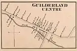 Guilderland Center includes the factories established at French's Mills, the first of these was built in 1795 by Peter Broeck. The name French's Mills (also referred to as French's Hollow) comes from Abel French, who established a mill of his own here in 1800.[1] French's Hollow and the mills were mostly destroyed when the Black Creek was dammed for the creation of the Watervliet Reservoir in 1916. Abel French's Mill was razed and became the site of the pumping station.[2] Guilderland Center was originally called by the locals Bang-all, in reference to ill effects and reputation that rum, horse racing, and the rough manners of the place brought. Circa 1803, when the town of Guilderland was formed from Watervliet, the name Guilderland Center began to come into fashion; the post office when established also took the name Guilderland Center. By 1866, the hamlet had a population of 450.[1] In 1860 District Number 6 Cobblestone School was built in Guilderland Center, and though the building has not been used as such since 1941, it is still owned by the Guilderland Central School District.[2] The school building is on the National Register of Historic Places.