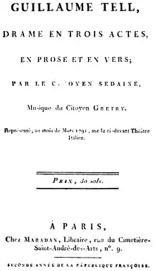 Guillaume Tell (William Tell) is an opéra comique, described as a drame mise en musique, in three acts by André Grétry, The French text was by Michel-Jean Sedaine based on a play of the same name by Antoine-Marin Lemierre.