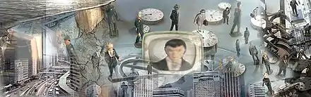 Ramos-Poquí refers to his intimate works of the 1980s as ‘symbolic paintings' which were followed during the 90s by a series driven by urban inspiration known as ‘Satirical and Metaphysical Urban paintings’, executed while he was developing digital photomontages.[11] Having already produced lithographs and etchings, it was during this period that he explored the possibilities of this new digital medium.[12] His digital photomontages were exhibited in London. They were praised by art critics including es: José Corredor-Matheos and reviewed in many London papers.[13][14] In 2001 he was commissioned to design the book covers for the Open University course 'Exploring Psychology.'[15] His assemblages, of a satirical nature, were exhibited both in London and Belfast.