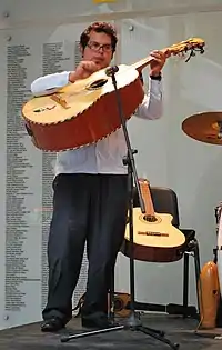 - One American player using the guitarrón in a non-traditional context is Aaron Goldsmith, formerly of the New York-based multicultural acoustic ensemble Luminescent Orchestrii; he uses a modified guitarrón with an elongated neck that allows him to play melodically.