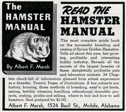 In 1946 Albert Marsh of Mobile, Alabama, won a hamster as payment for a $1 gambling debt.[2] This hamster came probably from the breeding stock managed by Guy Henry Faget in Carville, Louisiana.[3][4][2][5] At the time, Marsh was a highway engineer but unemployed.[3] After getting his hamsters, he learned to breed them and founded Marsh Enterprises and the Gulf Hamstery, which promoted Syrian hamsters as pets, for laboratory use, and in business schemes.[3] Marsh took advertisements in magazines, comics, and livestock trade journals which praised hamsters as pets and presented the idea that breeding hamsters was a good business investment.[3] In his business, he shipped hamsters to people who would be breeders, then he coordinated the shipment of various breeders' hamsters to other breeders or to laboratories.[3]