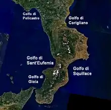 Anciently known as Scylleticus Sinus, from the ancient coastal city of Scylletium, which Strabo mentions is situated on the east coast of Bruttium (modern Calabria), situated on the shores of an extensive bay, to which it gave the name of Scylleticus Sinus.[3] It is this bay, still known as the Gulf of Squillace, which indents the coast of Calabria on the east as deeply as that of Hipponium or Terina (the Gulf of Saint Euphemia, Italian: Golfo di Sant'Eufemia) does on the west, so that they leave but a comparatively narrow isthmus between them.[4]