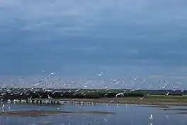 It has a total surface of 80.6 square kilometres (31.1 sq mi), and a maximum depth of 8 metres (26 ft).[1] It has a catchment area of 206 km2 (79.5 sq mi). Several area streams including Birch Bay Creek and Wilson Creek flow into Gull Lake. Its waters drain through a creek into the Blindman River and then in the Red Deer River.