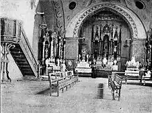 Though the design of the church is mainly Baroque, archival photos show that the interiors were mainly done in Gothic Revival architecture. Its retablos and arco toral design clearly reflects this style, possible due to its popularity in the early 19th century. The church was renovated, and the retablos, together with the pulpit, were lost.