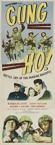 Gung Ho! (full title: Gung Ho!: The Story of Carlson's Makin Island Raiders) is a 1943 American war film directed by Ray Enright and starring Randolph Scott. The story is based somewhat on the real-life World War II Makin Island raid led by Lieutenant Colonel Evans Carlson's 2nd Marine Raider Battalion.