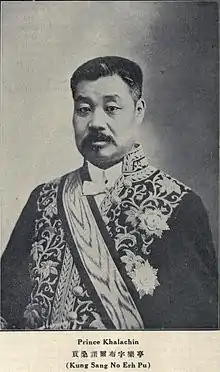 Gungsangnorbu (1871–1930) was an Inner Mongolian prince and politician of the Republic of China.[2] Some scholars describe him as a moderate, progressive moderniser caught between the influence of conservative older leaders and young radicals.[3] Others describe him less favourably as a conservative who, despite his early activities for promoting education, would go on to become protective of his own rights and interest as a member of the nobility, and suspicious of young Mongols who had received a modern education as potential challengers to those interests.[4]