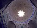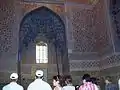 Inwardly the mausoleum appears as a large, high chamber with deep niches at the sides and diverse decoration. The lower part of the walls covered are by onyx slabs composed as one panel. Each of these slabs is decorated with refined paintings. Above the panel there is a marble stalactite cornice. Large expanses of the walls are decorated with painted plaster; the arches and the internal dome are ornamented by high-relief papier-mache cartouches, gilded and painted.