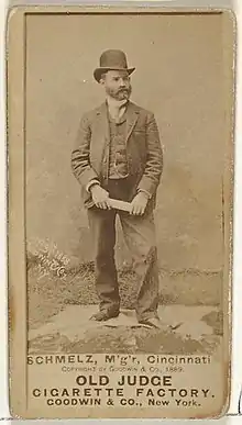 Gustavus Heinrich Schmelz (September 26, 1850 – October 14, 1925) was an American manager in Major League Baseball for the Columbus Buckeyes (1884), Cincinnati Red Stockings (1887–89), and Columbus Solons (1890–91) of the American Association, and for the St. Louis Maroons (1886), Cleveland Spiders (1890), and Washington Senators (1894–97) of the National League. He was regarded as a player's manager, but his camaraderie with his players did not translate to pennants, as he never finished higher than second place. His lifetime managerial record was 624–703 (.470).