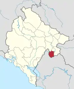 The town of Gusinje is the seat of the municipality. From 1953 to 2014, it was part of Plav Municipality. In 2014, it became again a distinct municipality. It covers 157 km2 (61 sq mi), 1.1% of the total area of Montenegro.[6] Much of the area of the municipality is mountainous land used in the past for livestock herding. The territory of Vusanje covers about 1/3 of the municipality. The municipality's settlements are Dolja/Doli, Dosuđe/Dosugja, Grnčar/Gërnçar, Kolenovići/Kolinë, Kruševo/Kryshevë, Martinovići/Martinaj, Višnjevo/Vishnjevë, Vusanje/Vuthaj and the town of Gusinje/Guci.[6]