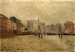 At the age of seventeen, he enrolled at the Kunstakademie Düsseldorf, where he studied landscape painting with Eugen Dücker. From 1884 to 1886, he was Dücker's master student. In the latter year, he went to the United States, to join a group of German painters in Milwaukee who had been commissioned by the American Panorama Company to paint cycloramas and panoramas of the Civil War. A photograph from that period shows him and his fellow artists in front of a cyclorama of the Battle of Chattanooga.[1] From 1887, together with Paul Wilhelmi and Otto von Ernst, he ran the "New Academy of Fine Arts" in Detroit.[2]