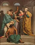 In 1848, as a student, Boulanger submitted a painting for the Prix de Rome; the entry did not win (it came in second), and the painting, Saint Pierre introduit dans la maison de Marie, mère de Jean, also called Saint Pierre chez Marie, was believed lost for 171 years until it was rediscovered in the attic of an old house in a small hamlet in Creuse, France. The painting represents a rare example of religious art by Boulanger. France 3 television called it "la trouvaille de l'année" (the find of the year).[61] It was auctioned at the Hôtel des Ventes in Guéret in November 2019 and realized €21,000.[62]