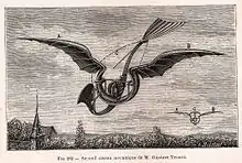 He next built an ornithopter, the wings of which flapped using a rapid succession gun cartridges, enabling it to make a noisy but at the time unheard-of flight of 80 meters.[20]
