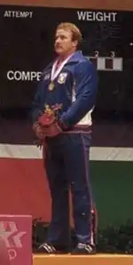 At the 1984 Summer Olympics, Carlton was a bronze medalist in the heavyweight competition, held at Loyola Marymount University's Albert Gersten Pavilion.[4] In his final clean and jerk, with the bronze medal secure, the 30-year old went for the gold medal by attempting a personal best lift of 225 kg, but was unable to get the bar to his chest.[5] His previous best total, 377.5 kg, was enough for the bronze medal, behind Italy's Norberto Oberburger and Romanian lifter Ştefan Taşnadi.[6] He remains, along with Mario Martinez, the last American male to win an Olympic weightlifting medal, as of 2016.[7]