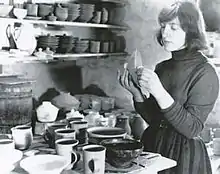 In 1966, after several visits, she moved to Achères, France where she bought a small house and set up her own pottery studio. She maintained a wood-fired kiln and dug her own clay. Though the clay was "faultless" she began increasingly to use porcelain bodies made for porcelain factories at Vierzon nearby.[3] "She never produced a standard line, published a catalogue or made a vase."[4]
