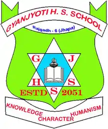 Gyanjyoti Higher Secondary School, situated at Rajgadh is a school of Jhapa district located south-east of the headquarters Chandragadhi.[1] Established in 1994 (2051 BS), it is providing quality education to the students. Initially started as primary level at Mr. Narayan Dhakal's house (former Principal) in 1949 BS, it has got its registration since 2051 BS. Later in 2057 BS, it produced the first S.L.C. Batch.