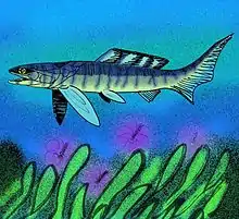 Gymnotrachelus hydei is a large selenosteid arthrodire placoderm known from the Late Famennian Cleveland Shale of Ohio.[2] It was originally reconstructed as physically resembling Selenosteus, with slightly smaller orbits (i.e., having a broad, box-like head). Later specimens led to a reappraisal, and now G. hydei is thought to have a more gar-like or barracuda-like build.[3]