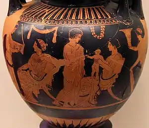 Free-born male citizens held political, social and economic power within the domestic and public sphere, as evidenced by the vast amount of historical records available regarding inheritance, property rights, and trade agreements.[6] Ancient law books and surviving artwork reveal inheritance and property rights favoring male kin and even male non-kin over the women of the household. The practice of exposing new born female babies revealed a society that favored the male sex.[6] The creation of specific rooms in the house designated for male only socialization appeared at a certain point in the Classical Greek period. The practice of holding symposium within the andron for the possible purpose of arranging economic agreements within the male aristocratic community is alluded to in many ceramic vases and murals.[7] It is in sifting through these surviving remnants of the domestic sphere that archeologists have been able to piece together an understanding of women's social, economic, and political realities.