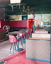 The interior featured 1950s furnishings and "pinball-panel" wall decorations.[1][3] In 1963, The Oregonian described the artwork on the interior walls, which included a large and colorful painting depicting a gypsy camp, and an "attractive" nude called Dian by Grace Harlow, a painter and former student of Louis Bunce.[4] The venue also featured "mottled" iridescent red windows that were translucent,[5] could seat 150 guests, and included a banquet area.[4]
