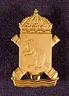 The colour of the regiment was presented to the regiment on 1 June 1945 by His Majesty the King Gustaf V at a ceremony at Stockholm Palace. It was used as regimental colour by KA 5 until 1 January 1998. The colour is drawn by Brita Grep and embroidered by hand in insertion technique probably by the company Libraria.[8] Blazon: "On red cloth in the centre the badge of the former Coastal Artillery; two gunbarrels of older pattern in saltire under a royal crown proper and over a blazing grenade and waves, all yellow. In the first corner the town badge of Härnösand; a beaver with a pike in its mouth, all white."[8]