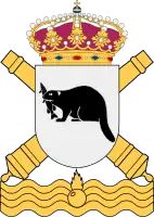 The coat of arms of the Härnösand Coastal Artillery Regiment (KA 5) was used by KA 5 from 1975 to 1994, by the Norrland kustartilleriförsvar med Härnösands kustartilleriregemente (NK/KA 5) from 1975 to 1994, by the Härnösands maringrupp med Härnösands kustartilleriregemente (HMG) from 1994 to 1997 and by the Härnösandsgruppen since 1997.[7] Blazon: "Argent, the town badge of Härnösand, a beaver, a pike in the mouth, both sable. The shield surmounted two gunbarrels of older pattern in saltire above a flaming grenade and waves".[7]