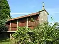 An hórreo is a typical granary from the northwest of the Iberian Peninsula (Asturias, Galicia, where it might be called a Galician granary, and Northern Portugal), built in wood or stone, raised from the ground (to keep rodents out) by pillars (pegollos in Asturian, pegoyos in Cantabrian, esteos in Galician, espigueiros in Portuguese, abearriak in Basque) ending in flat staddle stones (vira-ratos in Galician, mueles or tornarratos in Asturian, or zubiluzea in Basque) to prevent access by rodents. Ventilation is allowed by the slits in its walls.