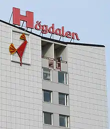 Notable landmarks in Högdalen are the neon rooster on top of an apartment block in the commercial area, and the golden rooster on top of the local church.