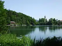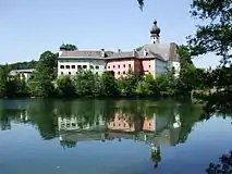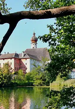 The monastery with its rococo church on a peninsula in Lake Höglwörth represents one of the finest ensembles in the eastern Upper Bavaria. The church was rebuilt from 1675. The choir was preserved from the Romanesque church.[2] Before silting to the east the monastery was on an island, but it is now on a peninsula.[3] Wörth is an old word for island, and it is still shown as an island on the field map from the 19th century.[4]