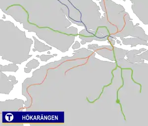 Hökarängen metro station is on the green line of Sweden's Stockholm metro, located in Hökarängen, Söderort. The station was inaugurated on 1 October 1950 as part of the inaugural stretch of Stockholm metro between Slussen and Hökarängen. On 18 November 1958 the line was extended south to Farsta.[2] The distance to Slussen is 7.7 km (4.8 mi).