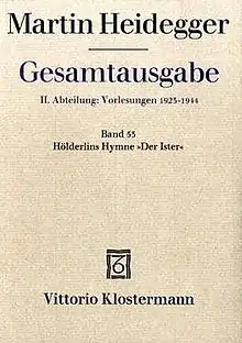 Hölderlin's Hymn "The Ister" (German: Hölderlins Hymne »Der Ister«) is the title given to a lecture course delivered by German philosopher Martin Heidegger at the University of Freiburg in 1942. It was first published in 1984 as volume 53 of Heidegger's Gesamtausgabe. The translation by William McNeill and Julia Davis was published in 1996 by Indiana University Press. Der Ister is a poem by Friedrich Hölderlin, the title of which refers to an ancient name for a part of the Danube River.