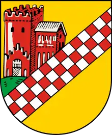 The Coat of Arms of the Stadtbezirk shows the Hörder Burg (Hörde Castle), overlaid with a red-and-white chequered band that was used as the sign of the Counts of Mark. The semicircle is originally green and represents a meadow. The background is golden.