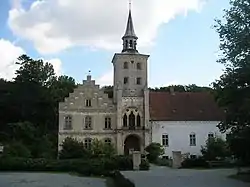 The castle is a three-winged complex built in the Historicist style which dominated Danish architecture at the time of its construction. The north-west wing and the tower were designed by Hans Jørgen Holm and built in 1859. The north-east and south-west wings were designed by August Klein and built in 1876. The complex is surrounded by moats.[1]