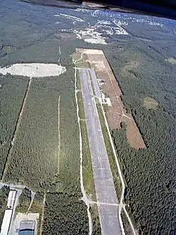 Luftwaffe soon took an interest in the airport plans and planning started in 1941. However, construction did not commence before 1943. A forest area 200 hectares (490 acres) was expropriated from Egge Farm and 200 Norwegians were hired to cut down the forest. Under the command of Erwin Keller, further construction was carried out by a combination of Organisation Todt, prisoners of war and Norwegian contractors.[3] The plan for construction was extensive and was planned as one of the largest airports in Norway.[4] This included a runway, a dummy runway on the other side of the Randsfjorden Line, a taxiway and hardened aircraft shelters, among others.[5] The airport was completed in September 1944, by which time it had received an 1,800-by-60-meter (5,910 by 200 ft) runway. It also had landing lights and an instrument landing system, as well as a Lorenz radar.[6]