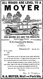 H. A. Moyer Automobile Company (1908–1915), a manufacturer of luxury automobiles in Syracuse, New York, was founded by Harvey A. Moyer (1853–1935) of Clay, New York.[1] The company began business in 1876 in Cicero, New York, as H. A. Moyer Carriage Company. As the era of the horse-drawn carriage came to an end, Moyer switched assembly to motor vehicles, although he still produced carriages for some time after that.