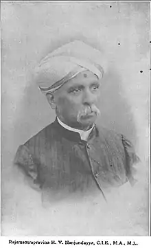Hebbalalu Velpanur Nanjundaiah CIE (1860 – 1920) was the acting Diwan of Mysore, founder and first Vice Chancellor of the University of Mysore, senior judge of the Mysore State High Court and founding president of the Kannada Sahitya Sammelana.[1] He presided over Kannada Sahitya Sammelana from 1915 to 1917 held in Bangalore and Mysore. He was one of the first documented ethnographers in the world,[2] having authored a seminal book Mysore tribes and Castes in 1906,[3] among other books on legal matters.