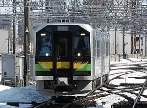 The H100 series (H100形) is a Japanese diesel-electric multiple unit (DEMU) train type introduced by Hokkaido Railway Company (JR Hokkaido) to replace the ageing KiHa 40 series DMU cars.[1] The trains are nicknamed "DECMO", standing for "diesel electric car with motors".[2] They commenced passenger operations in March 2020 on the Hakodate Main Line.[3]