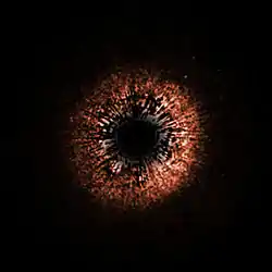 The star's circumstellar disc has dimensions of approximately 210 × 300 AU.[9] The dusty ring is cool, with a temperature of 51 K (−222 °C; −368 °F), and has a dust mass of 0.250±0.004 MEarth and nearly no gas.[13] Analysis of the debris disk in the far-infrared and submillimeter wavelengths, carried out using the Hubble Space Telescope, suggests the presence of small grains in the disk.[7] The disk appears to be slightly elongated to form an ellipse with its minor axis at a position angle of 58° ± 5°; working under the assumption that the disk is in fact circular gives it an inclination of 25° ± 5° from the plane of the sky.[7] An analysis published in 2009 suggests the possible presence of a planet at a separation of 45-75 AU,[10] in the wide gap centered at 75.4 AU[13] which may be carved by the planet, but no planet with mass exceeding 1-2 MJ was observed in the gap.[14]