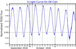 HD 12039, also known as DK Ceti, is a variable star in the constellation of Cetus at a distance of about 133 ly (41 pc). It is categorized as a BY Draconis variable because of luminosity changes caused by surface magnetic activity coupled with rotation of the star.[10] The stellar classification G4V is similar to the Sun, indicating this is a main sequence star that is generating energy at its core through the thermonuclear fusion of hydrogen. The effective temperature of 5,585 K[5] gives the star a yellow hue. It has about the same mass as the Sun, but only emits 89% of the Sun's luminosity. This is a young star with age estimates ranging from 7.5−8 million years[11] to 30 million years.[7]