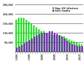 Mortality rates in Zimbabwe attributed to the HIV/AIDS epidemic continue to decline along with diagnosed infections. As of 2018, UNAIDS reported that there had been a 60 percent decrease in AIDS-related deaths since 2010, along with a 24,000 person decrease in new HIV infections.[15] In this same year, data from the Centers for Disease Control and Prevention reports that there was an estimated 19,000 deaths from the virus, a noticeable decrease from previous years.[16] The most common cause of death for people living with HIV/AIDS in Zimbabwe continues to be coexistence of the virus with tuberculosis.[17] Data surrounding a demographic breakdown of deaths related to HIV/AIDS is limited because it is illegal to do sex work or have MSM sex.[18]