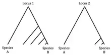A test that suggests selection: Again suppose you have data as in the last example, only this time locus 2 has equal divergence to locus 1 and yet lower polymorphism in species B. In this case the rate of mutation in each locus is equal, so this can only be explained by a reduction in the effective population size Ne of species B, which is inferred as an act of selection.