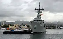 Original armament for the ship consisted of a Mark 13 missile launcher configured to fire RIM-66 Standard and RGM-84 Harpoon missiles, supplemented by an OTO Melara 76-millimetre (3.0 in) gun and a Vulcan Phalanx point-defence system.[7][8] As part of the mid-2000s FFG Upgrade Project, an eight-cell Mark 41 Vertical Launch System was fitted, with a payload of RIM-162 Evolved Sea Sparrow missiles.[9] For anti-submarine warfare, two Mark 32 torpedo tube sets are fitted; originally firing the Mark 44 torpedo, the Adelaides later carried the Mark 46, then the MU90 Impact following the FFG Upgrade.[8][10] Up to six 12.7-millimetre (0.50 in) machine guns can be carried for close-in defence, and since 2005, two M2HB .50 calibre machine guns in Mini Typhoon mounts have been installed when needed for Persian Gulf deployments.[8][11] The sensor suite includes an AN/SPS-49 air search radar, AN/SPS-55 surface search and navigation radar, SPG-60 fire control radar connected to a Mark 92 fire control system, and a Mulloka hull-mounted sonar.[8] Two helicopters can be embarked: either two S-70B Seahawk or one Seahawk and one AS350B Squirrel.[8]