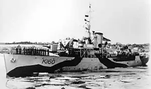 Flower-class corvettes like Lethbridge serving with the Royal Canadian Navy during the Second World War were different from earlier and more traditional sail-driven corvettes.[4][5][6] The "corvette" designation was created by the French as a class of small warships; the Royal Navy borrowed the term for a period but discontinued its use in 1877.[7] During the hurried preparations for war in the late 1930s, Winston Churchill reactivated the corvette class, needing a name for smaller ships used in an escort capacity, in this case based on a whaling ship design.[8] The generic name "flower" was used to designate the class of these ships, which – in the Royal Navy – were named after flowering plants.[9]