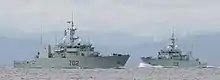 The Kingston-class coastal defence vessel was designed and built as a result of the Maritime Coastal Defence Vessel Project undertaken by the Department of National Defence beginning in the mid-1980s. Aimed to fulfill the minesweeper, coastal patrol and reserve training needs of the Canadian Armed Forces, the Kingston class replaced the Anticosti and Bay-class minesweepers, Porte-class gate vessels and Royal Canadian Mounted Police coastal launches. Following their construction, the vessels became known as the Kingston-class maritime coastal defence vessels (MCDVs).[2] The Kingston class was designed to conduct eighteen-day coastal defence missions, with a mixed gender crew of twenty-four, and the ability to deploy out of area for up to six months with a crew of thirty-seven for mine warfare or training missions.[3] In order to perform the various duties assigned to them, the Kingston-class vessels are designed embark mission-specific payloads contained in three powered 6.1-metre (20 ft) ISO containers on the open deck aft.[4] Seven module types available for embarkation on the Kingston class include: four route survey, two mechanical minesweeping and one bottom inspection modules.[2]
